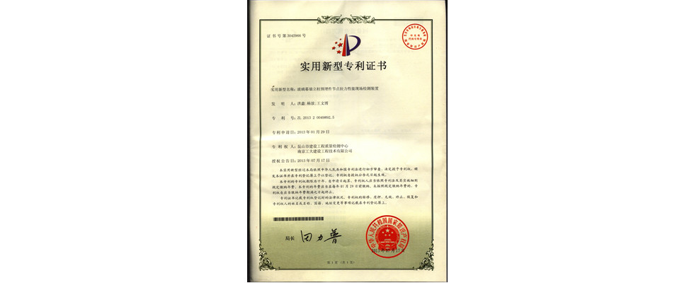 實(shí)用新型專利證書(shū)(玻璃幕墻預(yù)立柱埋件節(jié)點(diǎn)拉力性能現(xiàn)場(chǎng)檢測(cè)裝置洪鑫等)